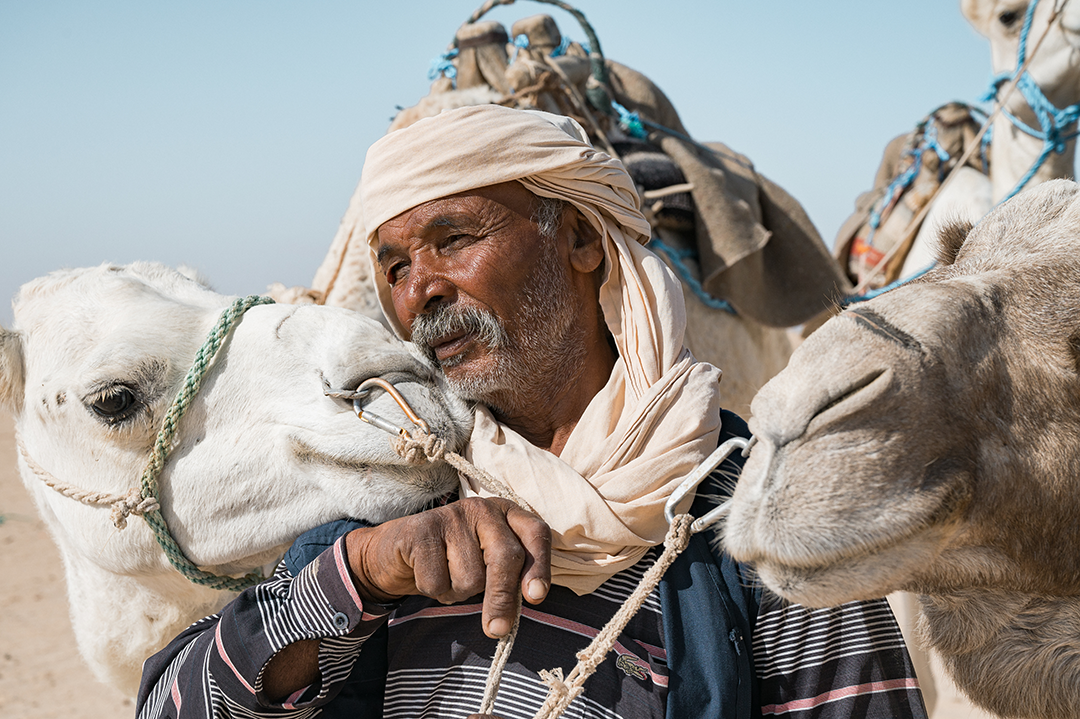 Πριν φτάσουμε Τύνιδα, επικοινώνησα με ένα παγκόσμιο γκρουπ ποδηλατών που κάνουν ακριβώς ό,τι εμείς: ταξιδιωτικό ποδήλατο. Στην Τυνησία, αν και απαριθμεί ελάχιστα μέλη, καταφέραμε να γνωρίσουμε από κοντά τον Μοχάμεντ. “Θα μείνετε σε μένα, δεν το συζητώ!”, ήταν οι πρώτες κουβέντες του στο τηλέφωνο. Μας βρίσκει στα μέσα της διαδρομής για το Μετλάουι, της πόλης από την οποία κατάγεται και στην οποία διαμένει. Εγκάρδιος και ορεξάτος αρχίζει να μας διηγείται τις ποδηλατικές του ιστορίες. Σταματώ να φωτογραφίσω κάποιες ελεύθερες καμήλες που τυγχάνουν να περάσουν σχετικά κοντά μας.